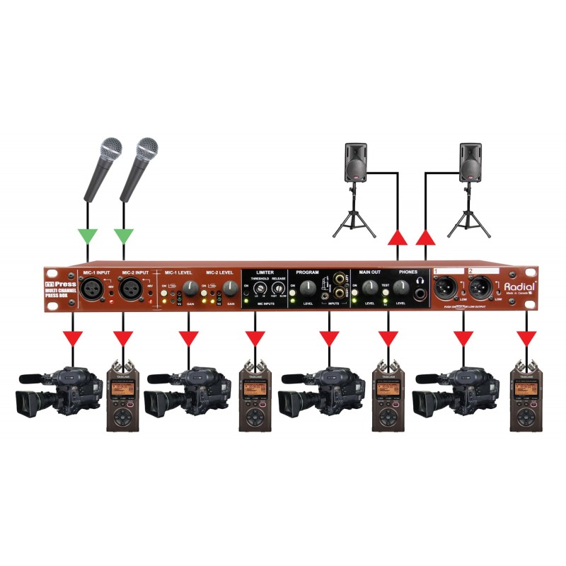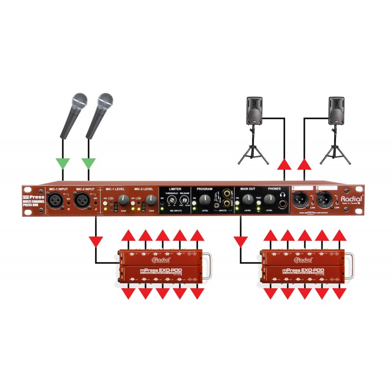 mPRESS di Radial Engineering è una Press Box modulare analogica in grado di gestire fino a 448 uscite, è dotato di drive attivo con transformatore di isolamento per eliminare il rumore, può riprodurre musica di sottofondo in stand by è un dispositivo utile per diffondere e distribuire segnali audio a tribune stampa durante eventi internazionali.
